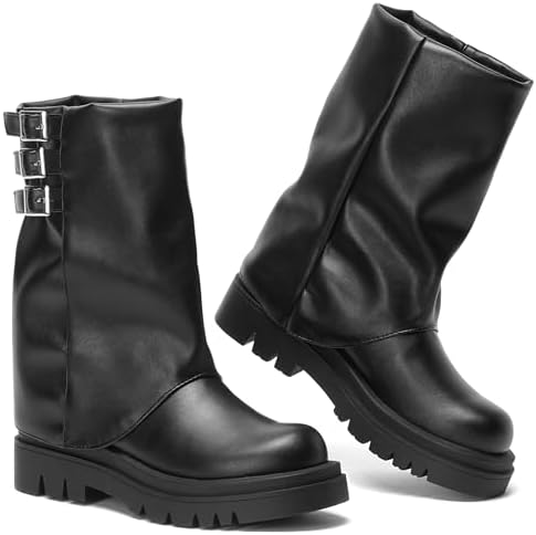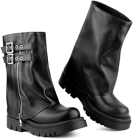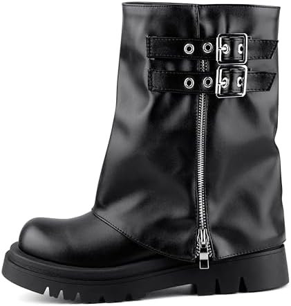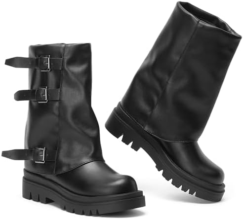 Make a statement with our fold-over boots, crafted from distressed faux leather. Featuring bold buckle straps and asymmetrical folds, these boots embody the rebellious spirit of motorcycle and punk fashion, ensuring you stand out wherever you go.