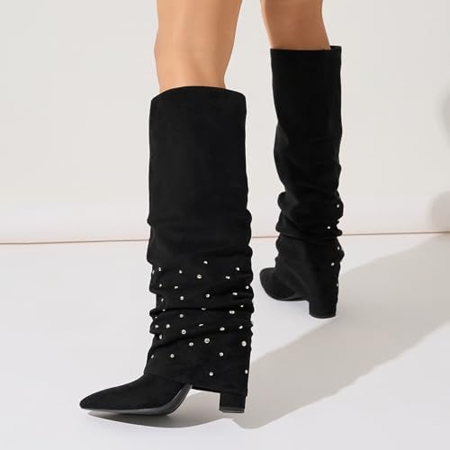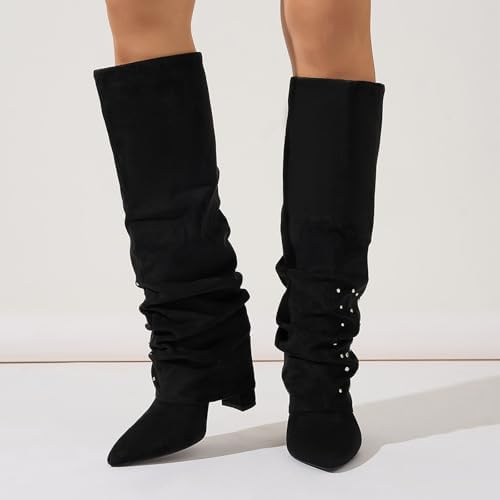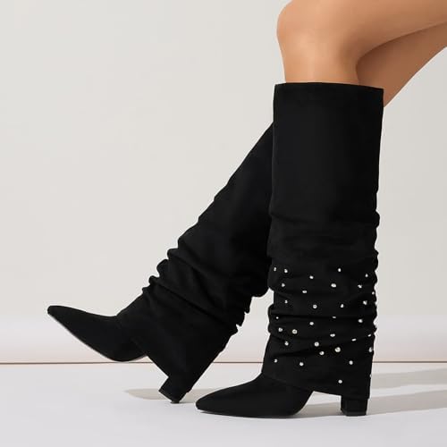 Tailored with a wide calf fit, these knee-high boots combine dramatic flair with ease of wear. The ruched, fold-over shaft adds volume, making these boots a standout choice for colder months and ensuring you make an impression wherever you go.